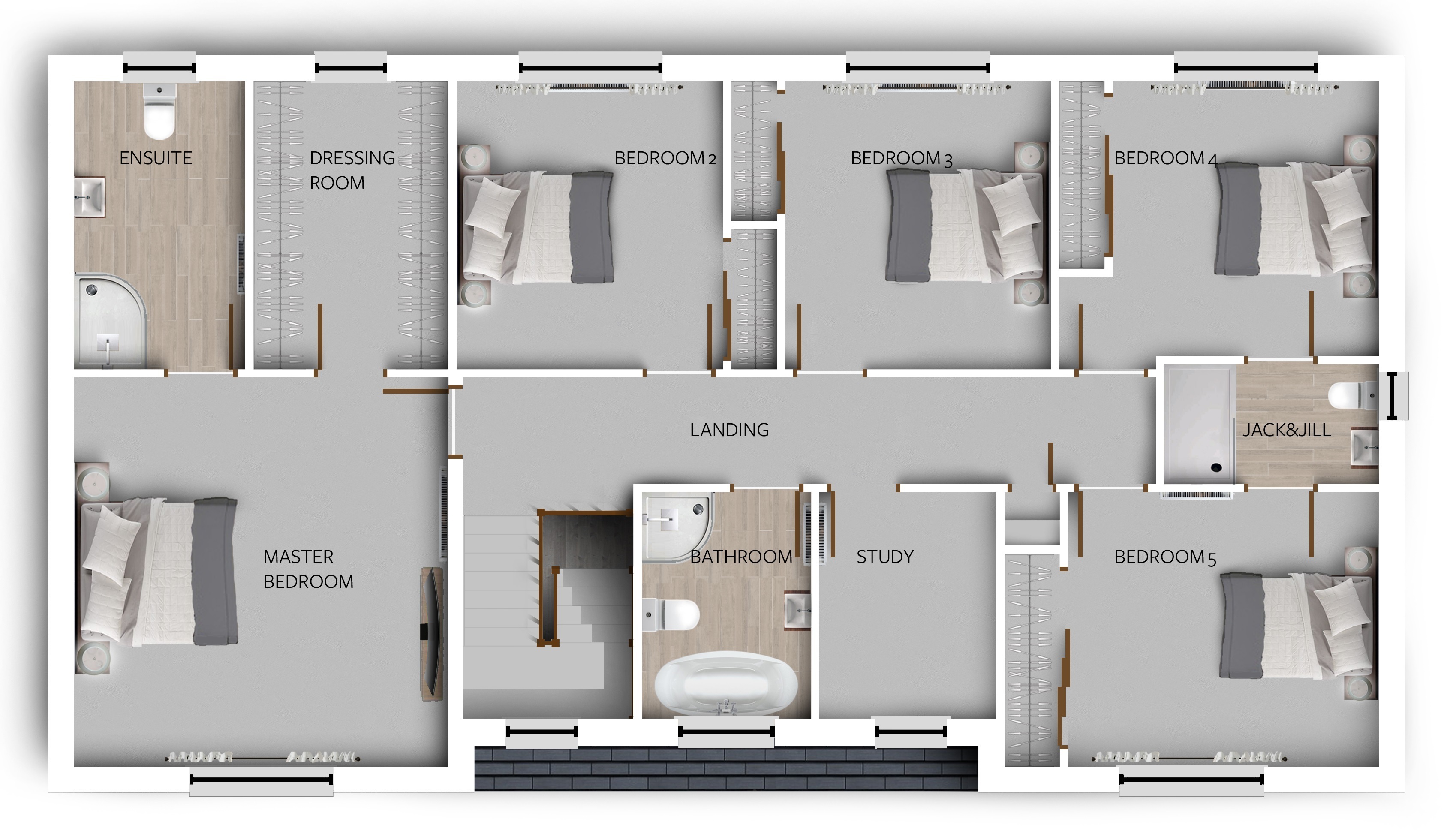 The Braemar is a prestigious home that exudes luxury. The welcoming entrance hall leads you to a formal lounge that is ideal for entertaining, and a generous kitchen/dining/living space on open plan which allows easy access to the back garden. Additionally, there is a cloakroom, a utility room and an integral double garage. The first floor boasts a convenient study as well as 5 generously sized double bedrooms. The master bedroom is fitted with an impressive dressing room and en-suite shower room. Two bedrooms share a jack-and jill en-suite shower room, and the remaining two bedrooms are served by a family bathroom.