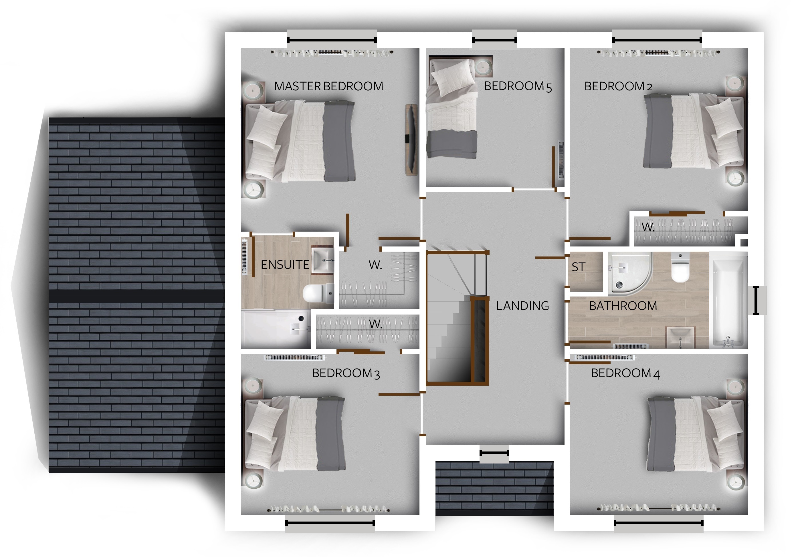 The attractive design of the Tolquhon provides a superb level of accommodation throughout. The ground floor comprises a spacious lounge and office/playroom which offer views of the front garden; an open plan kitchen/dining/ family room providing ample space for relaxed, family living, with patio doors giving easy access to the back garden for al fresco dining; a separate utility room giving a means of entry from the attached, double garage; and a cloakroom. All five bedrooms are located on the first floor; the master bedroom boasts a dressing room and en-suite shower room, with the four remaining bedrooms being served by a family bathroom.