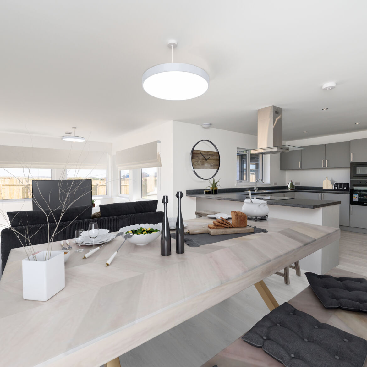 The modern design of the Delgatie provides a generous family home with the added benefit of being all on one level. The impressive lounge and dining room are front facing, bright and airy. The open plan kitchen/dining room is perfect for relaxed living and allows easy access to the garden. The separate utility room allows entry from the integral garage. The master bedroom benefits from an en-suite shower room, while the three further double bedrooms boast built-in storage and are served by a family bathroom.