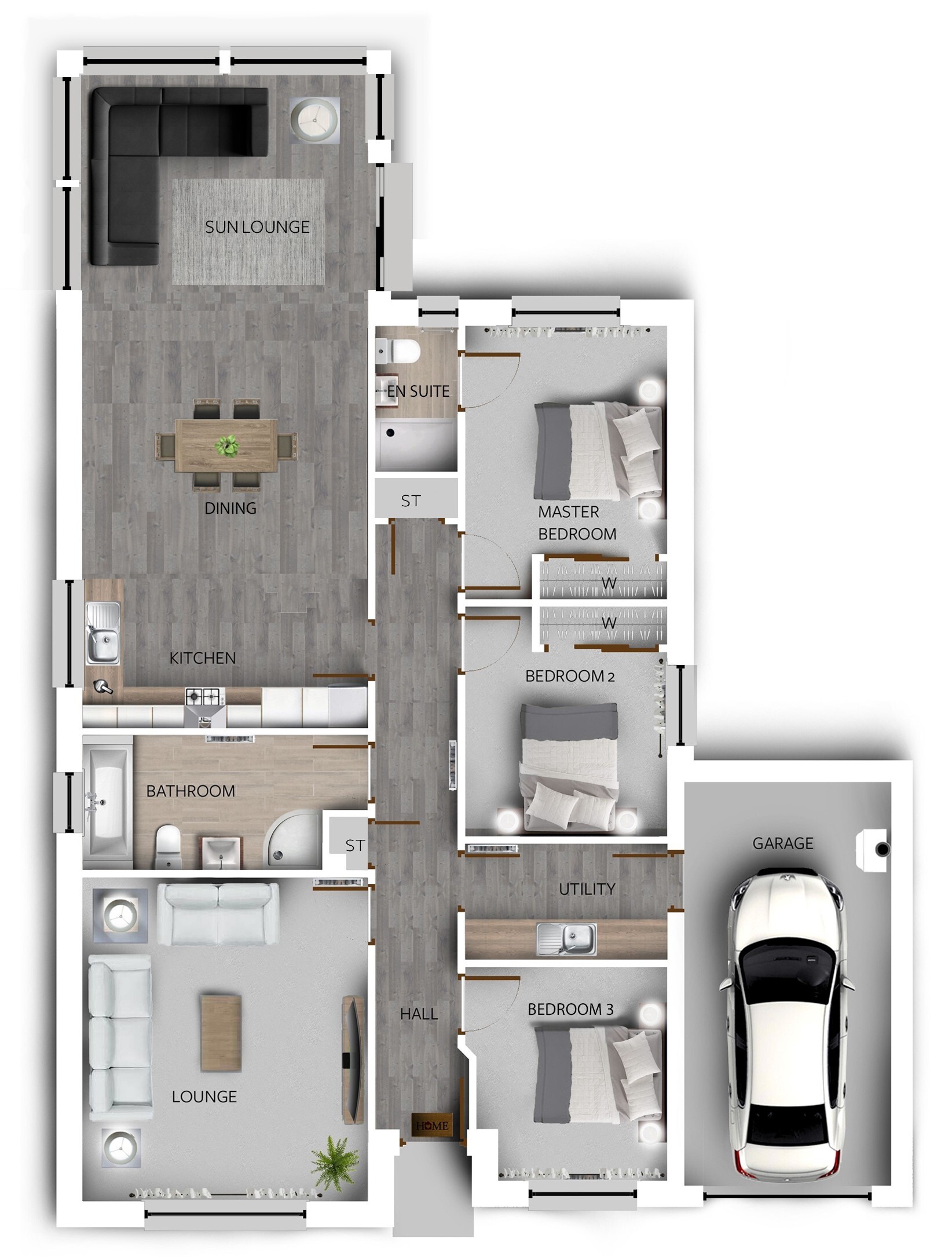 Packed with charming features inside and out, the Clyde offers perfectly proportioned living accommodation, all on one level. The large windows to the front-facing lounge make the room feel light and airy, and the patio doors from the open plan kitchen/dining room make it a perfect space for entertaining. A separate utility room gives access to the attached garage. Two of the three double bedrooms have built-in mirrored wardrobes. The master bedroom is also fitted with an en-suite shower room, and there is a family bathroom.